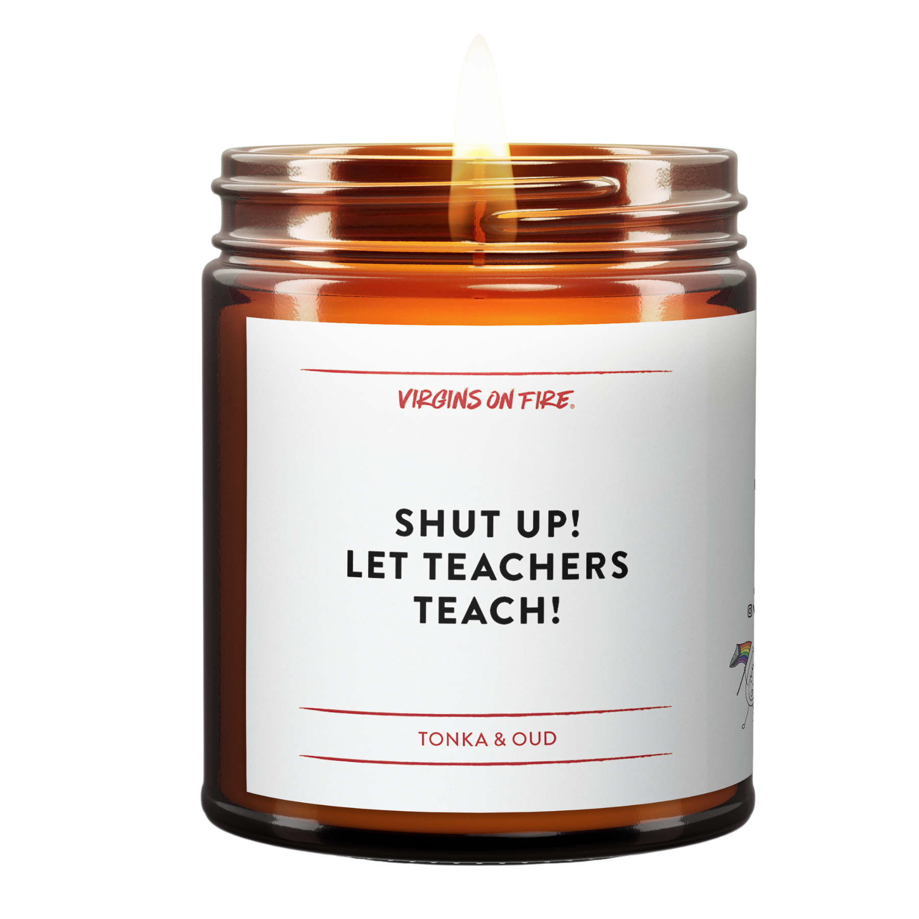 From Virgins on Fire Candle Co. these quality jar candles are made with 100% soy wax and handmade in Brooklyn, NY using only safe phthalate-free fragrances sourced from socially responsible suppliers. The scent is Tonka & Oud, a woody scent of repeatedly banging your head against a school desk and wondering how on earth we got here. Parental rights, lolz. As if these people know what they're talking about. SHUT UP! LET TEACHERS TEACH! The 9oz candle carries a long 45-50 hour burn time.
