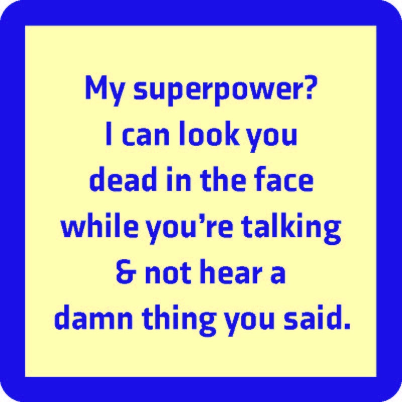 - Reads: "My superpower? I can look you dead in the face while you're talking & not hear a damn thing you said."