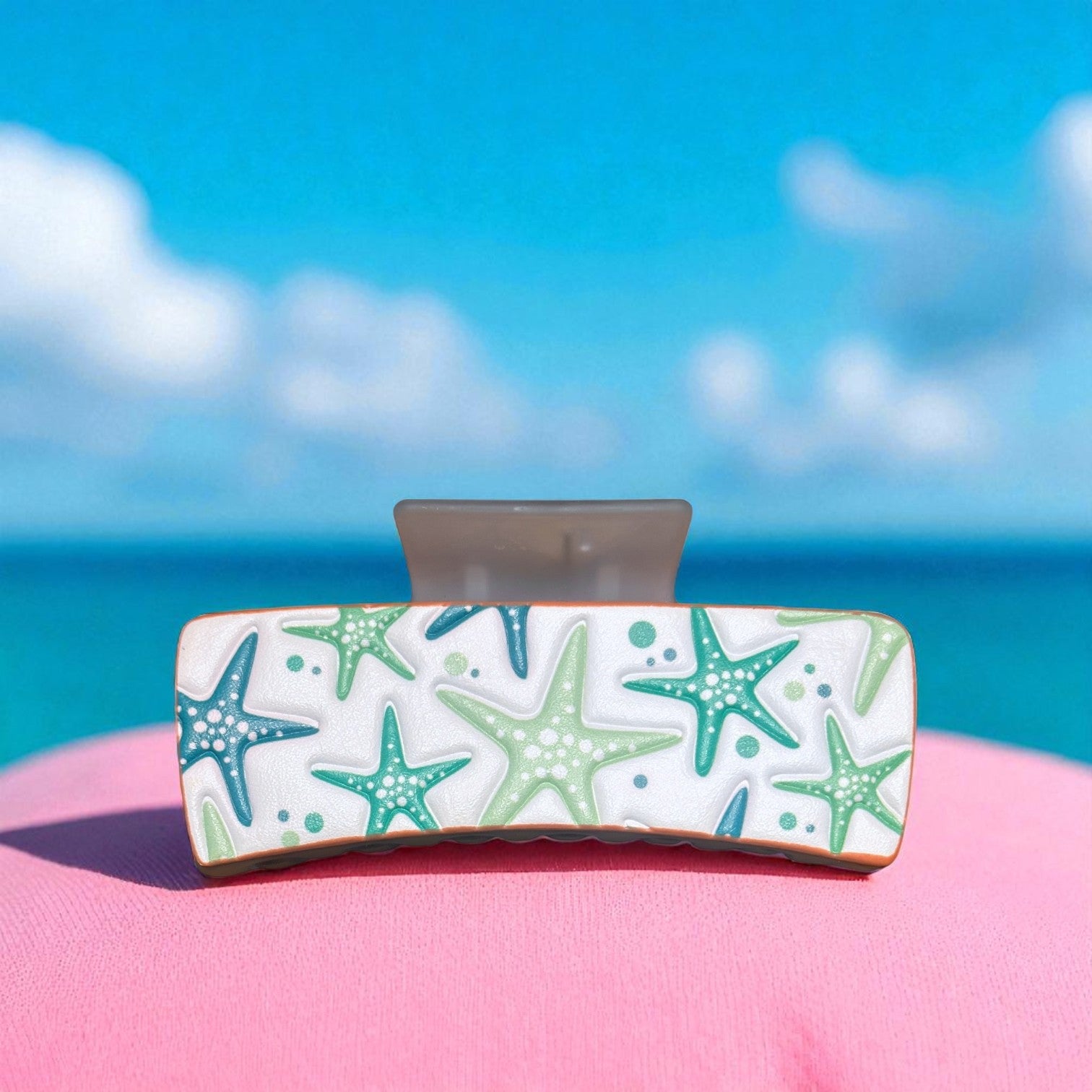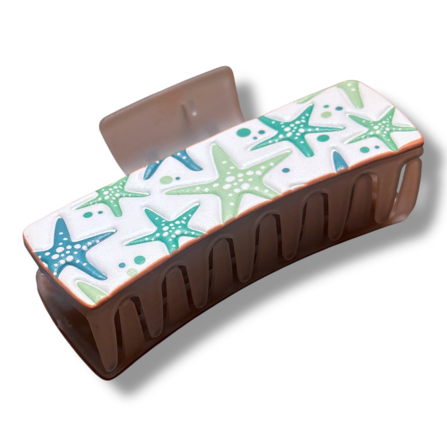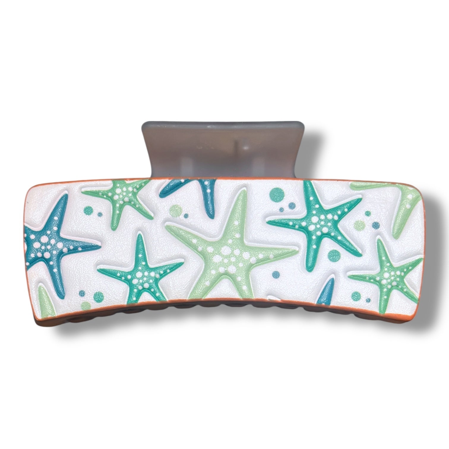 Add a pop of summer to your hair with this tooled leather hairclip! Covered with bright blue and green starfish, this clip is the perfect addition to any summer wardrobe.