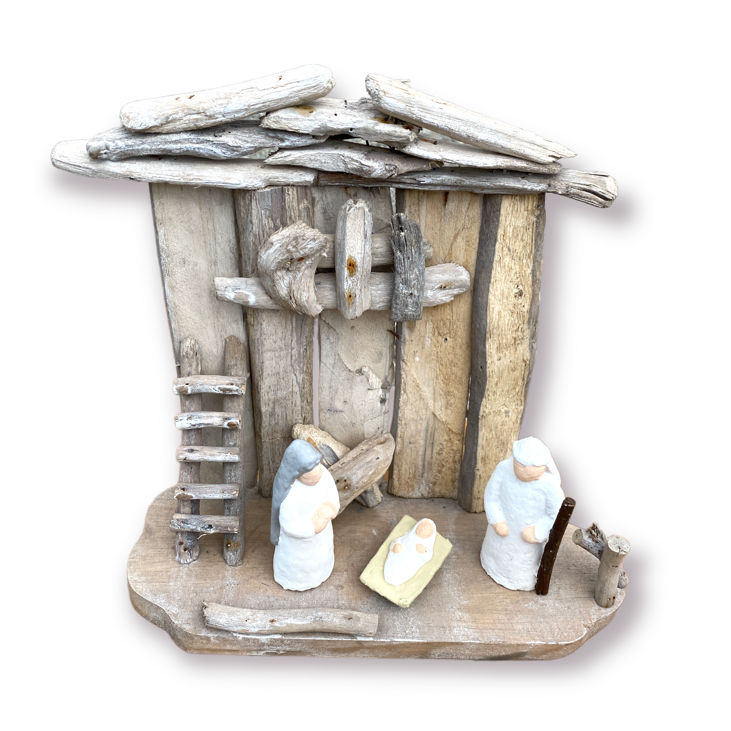 White Washed Driftwood Open Creche With Holy Family - 11-1/2-in