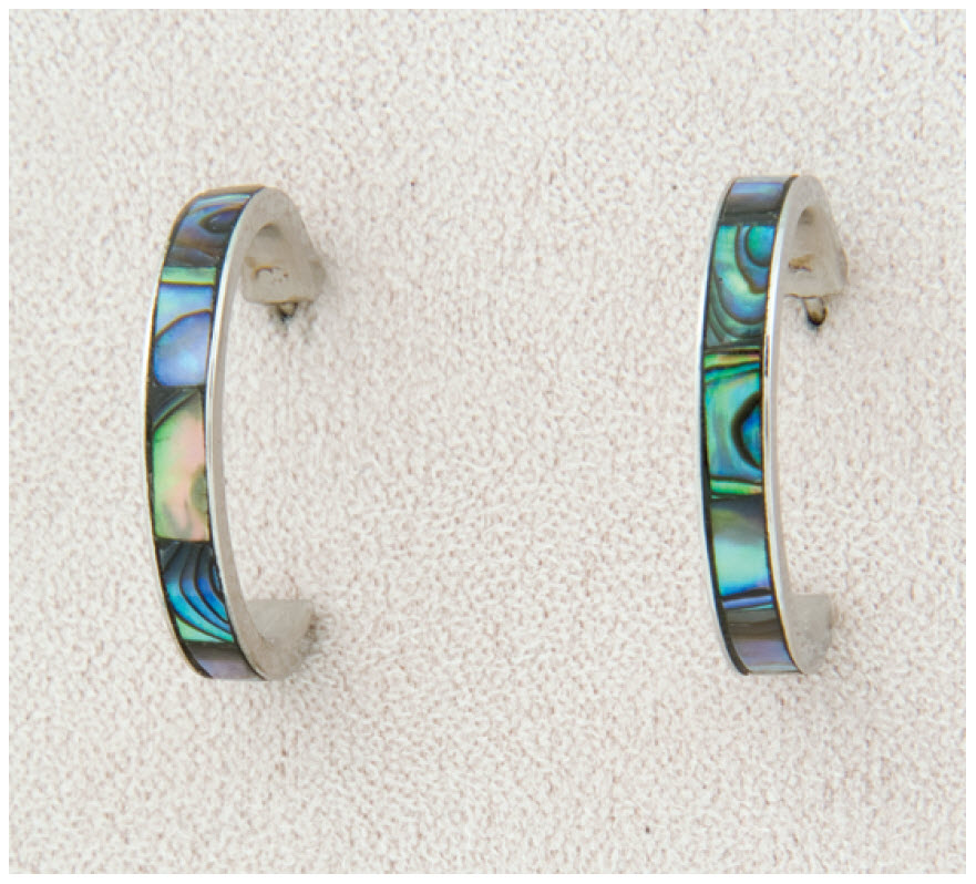 - A pair of beautiful abalone shell earrings, matched by hand to perfectly complement each other.