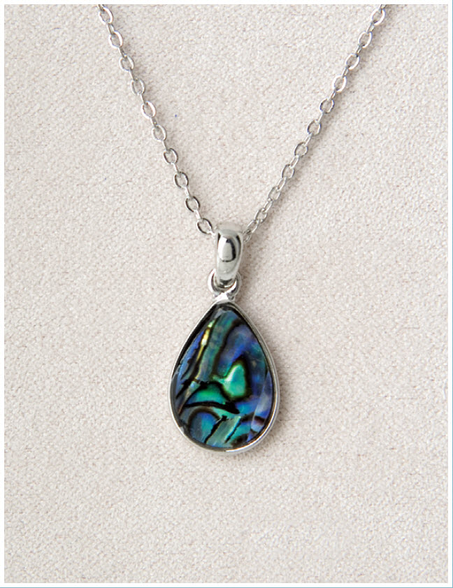 - A lovely abalone shell necklace with a framed pear-shaped pendant.