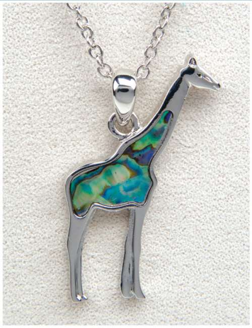 - A lovely abalone shell necklace with a giraffe pendant.