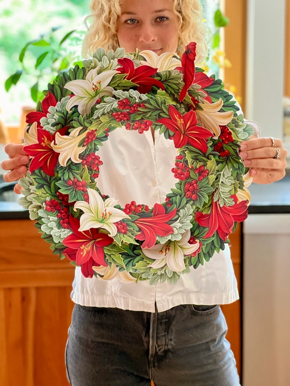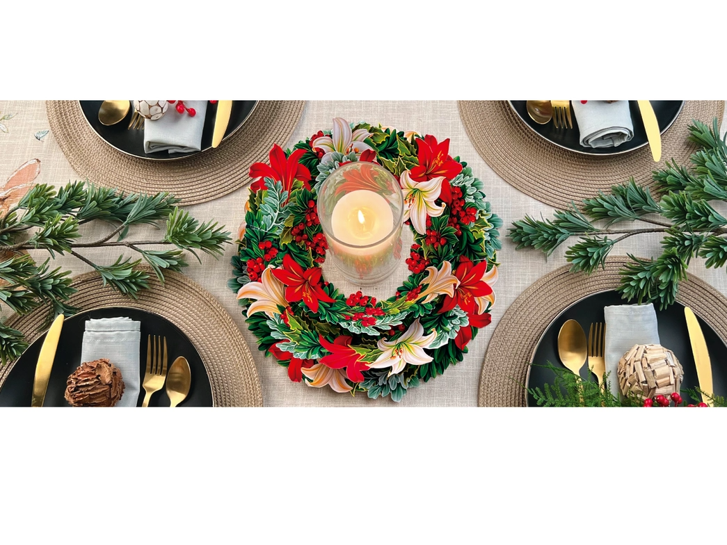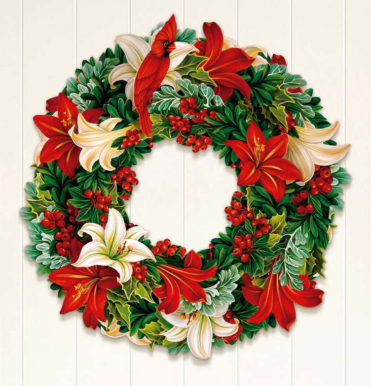 - Light up your space with this festive vision of red amaryllis and white lilies nestled in a bed of boxwood and holly.