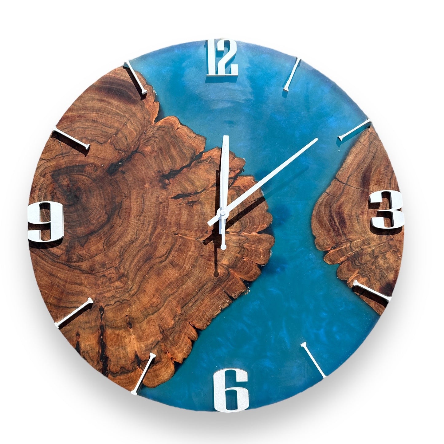 Introducing this most unique Wood And Blue Epoxy Round Wall Clock - 14-in, a statement piece that brings timeless sophistication to any interior. Expertly crafted to bring a touch of exclusivity to your home, the clock is crafted from a translucent blue epoxy with live edge wood, creating a subtle yet stylish contrast. Featuring white hands with sweeping second hand, hour markers with numerals and a 14-inch diameter, this clock is powered by 1 AA battery (not included) and guarantees to be the perfect addition to any modern home.